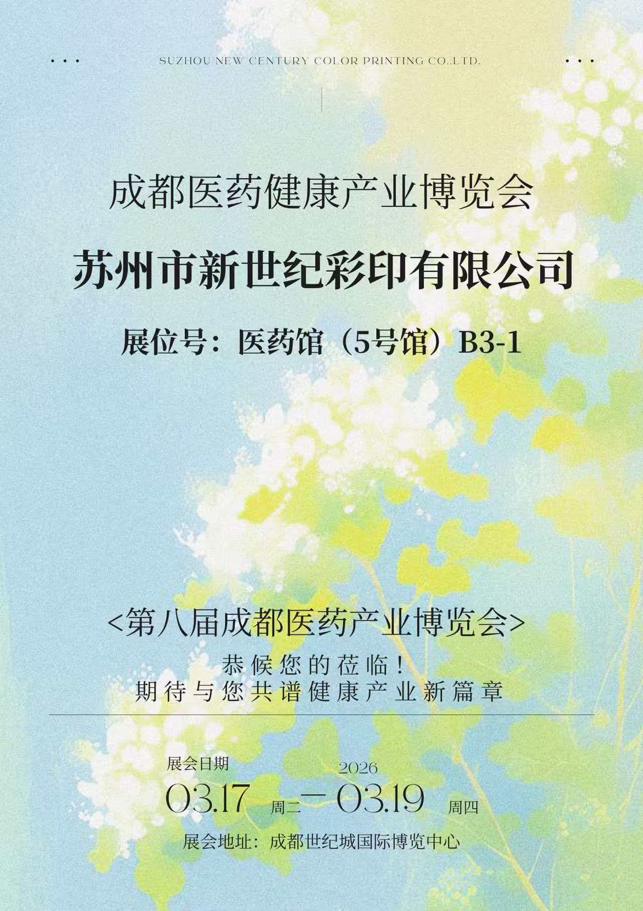 A die 17 Martii ad 19, 2026, Chengdu Medical et Health Industry Expo 8 magno tempore apud Chengdu Century City International Convention and Exhibition Centre tenebatur. Suzhou Novi Century Color Typographia Co., Ltd. (infra postea ad "Novum Century Typographiam") refertur: res gestas eius recentissimas in agro pharmaceutico in campo packaging umbraculum B3-1 in Aula Pharmaceutical (Hall 5), comprehendendo ostendens suam vim comprehensivam in pharmaceutical packaging printing, structural consilio, et obsequio officia. Multas societates pharmaceuticae et industriae peritos ad notiones sistendas et commutandas attraxit.